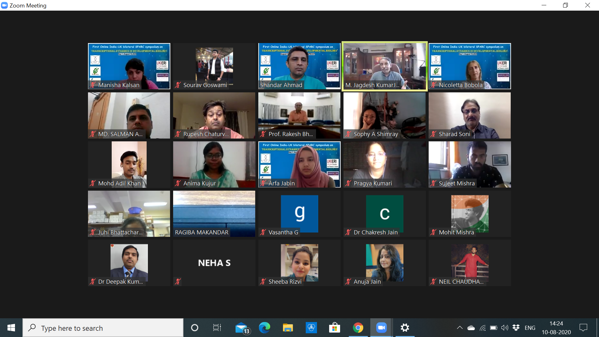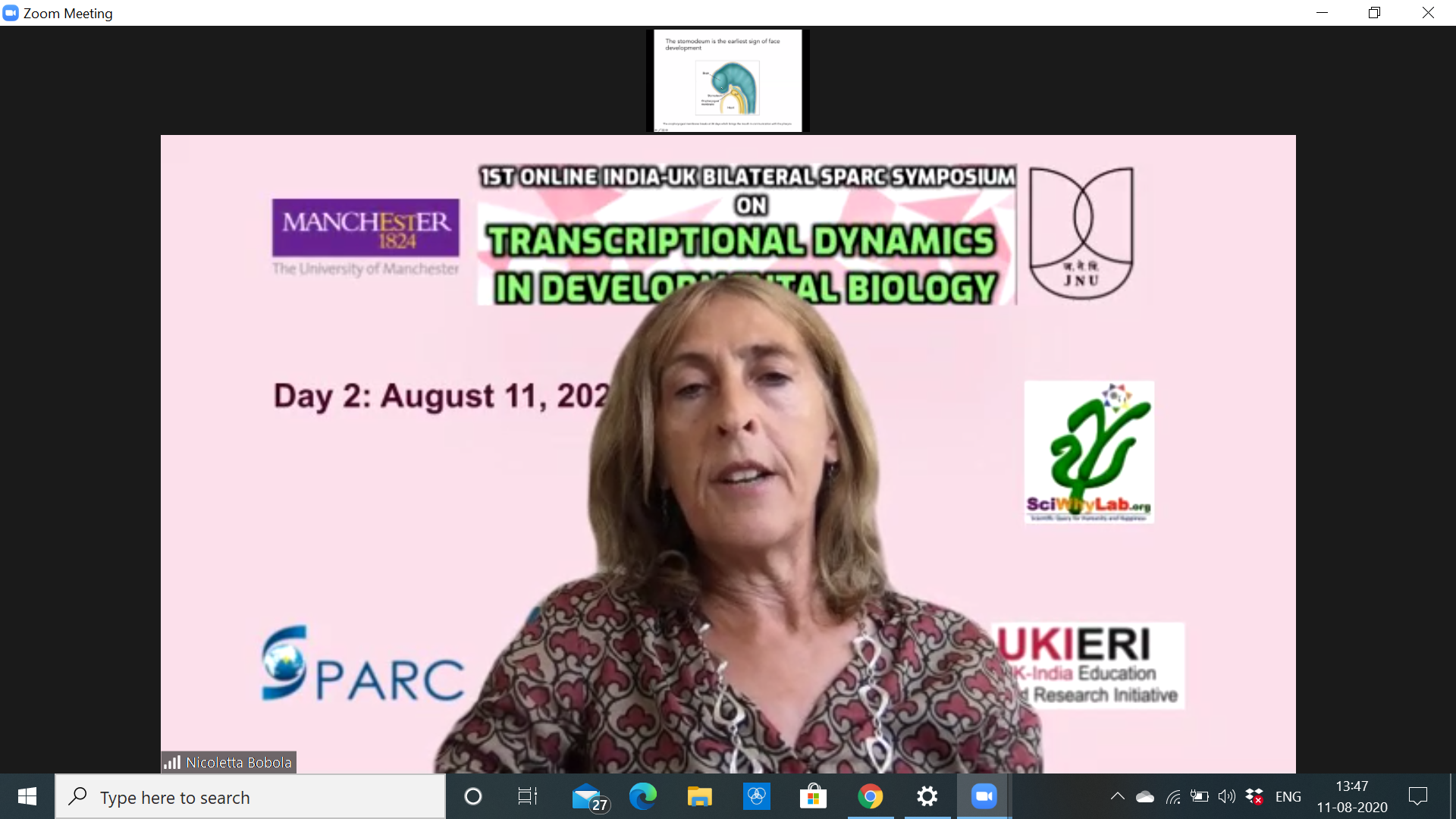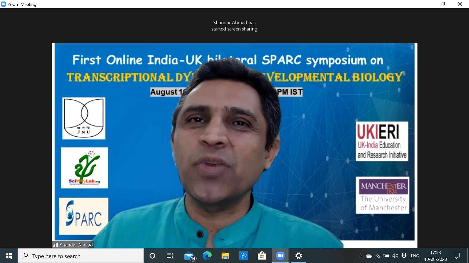 "First Online India-UK SPARC symposium on Transcriptional Dynamics in Developmental Biology", was organized in collaboration with Jawaharlal Nehru University, New Delhi and University of Manchester, UK on August 10-11, 2020 at 1:00 PM IST. This symposium was primarily sponsored by Scheme for Promotion of Academic Research Collaboration (SPARC) funded by the Ministry of Human and Resource Development, Govt. of India. In addition, contributions from UKIERI, University of Manchester and JNU were also acknowledged.