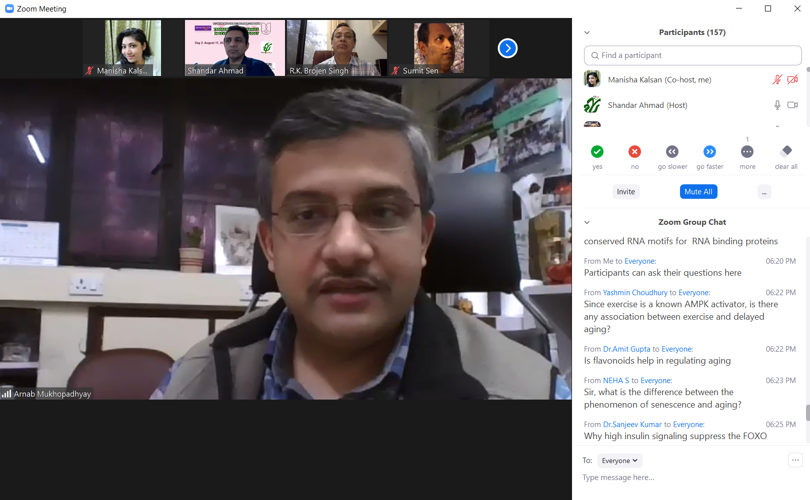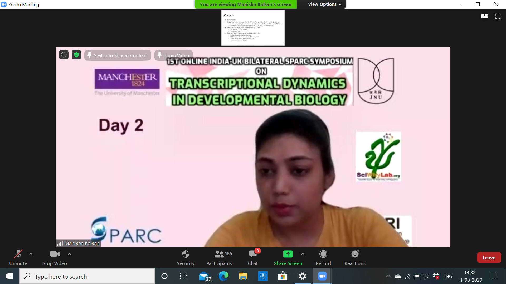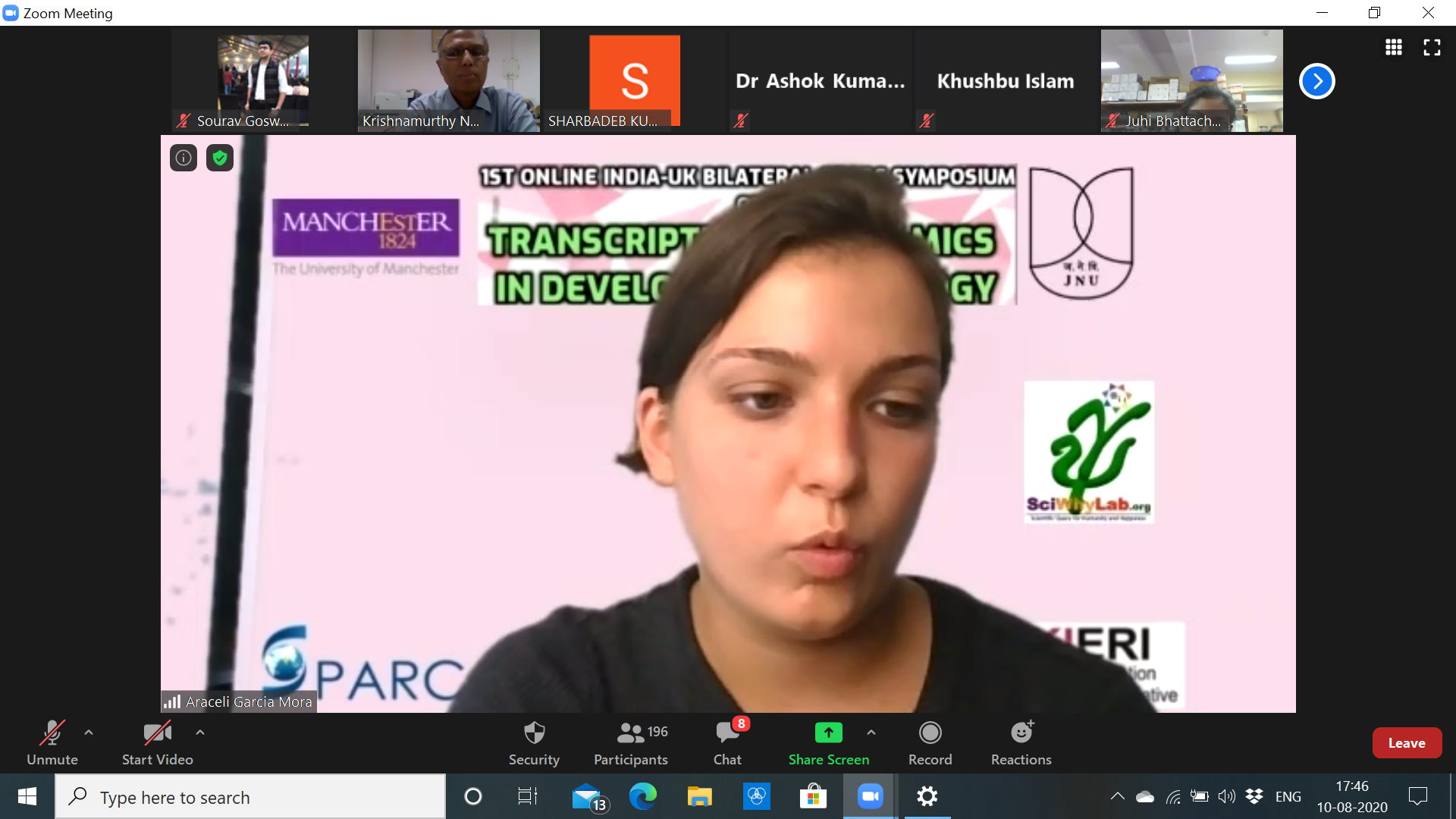 "First Online India-UK SPARC symposium on Transcriptional Dynamics in Developmental Biology", was organized in collaboration with Jawaharlal Nehru University, New Delhi and University of Manchester, UK on August 10-11, 2020 at 1:00 PM IST. This symposium was primarily sponsored by Scheme for Promotion of Academic Research Collaboration (SPARC) funded by the Ministry of Human and Resource Development, Govt. of India. In addition, contributions from UKIERI, University of Manchester and JNU were also acknowledged.